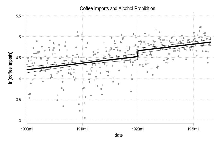 US national prohibition of alcohol began in January of 1920 and the full version of it last until March of 1933 when it was partially repealed for low ABV beverages. Prohibition was fully repealed in December 1933.Using the tools of microeconomics, we can regress the log of monthly coffee import volumes on time and add an indicator variable for prohibition. A sample period of 1900.01-1933.02 seems reasonable. The graphical results are below.