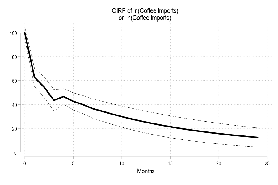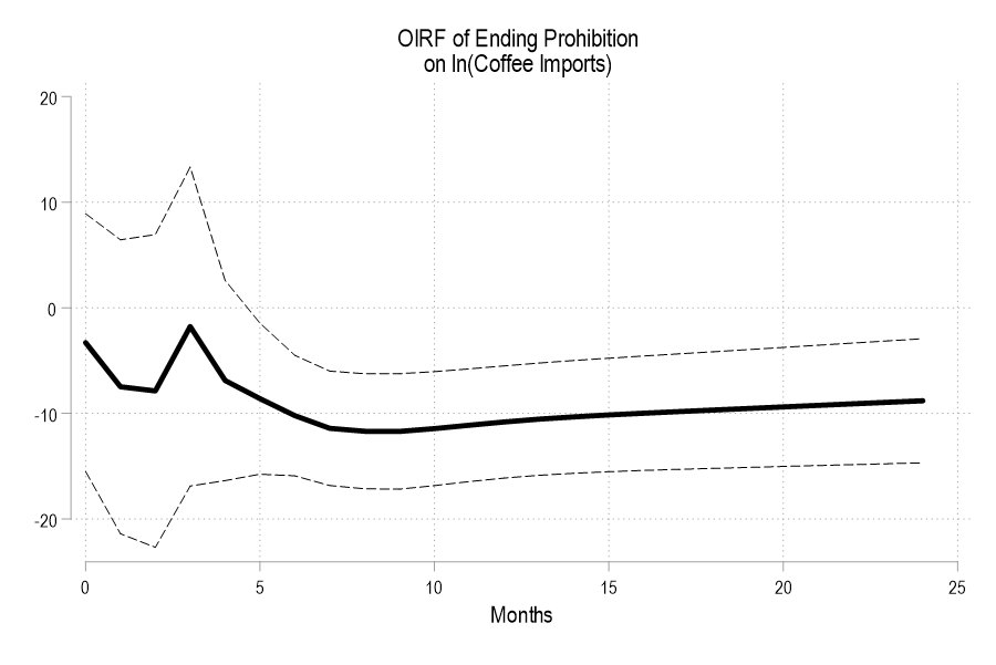 That’s the benchmark. Now we can ask: what was the *initial* effect of prohibition on coffee consumption? Below is the IRF that illustrates the initial effect of prohibition on coffee imports. Within about six months coffee consumption rose by 7%, reaching 9% by 19 months later.