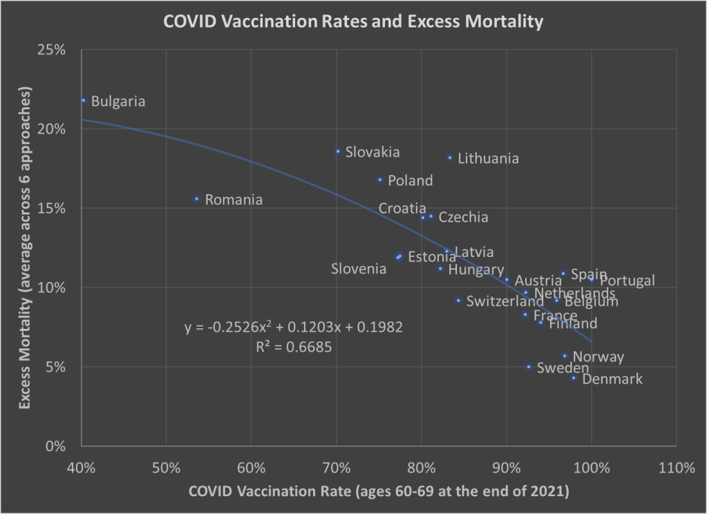 Here’s one more chart which I think is a very useful visualization, and it may give us some hint at causation. The following scatterplot shows COVID vaccination rates and excess mortality for a selection of European countries (more detail below on these measures and the countries selected):