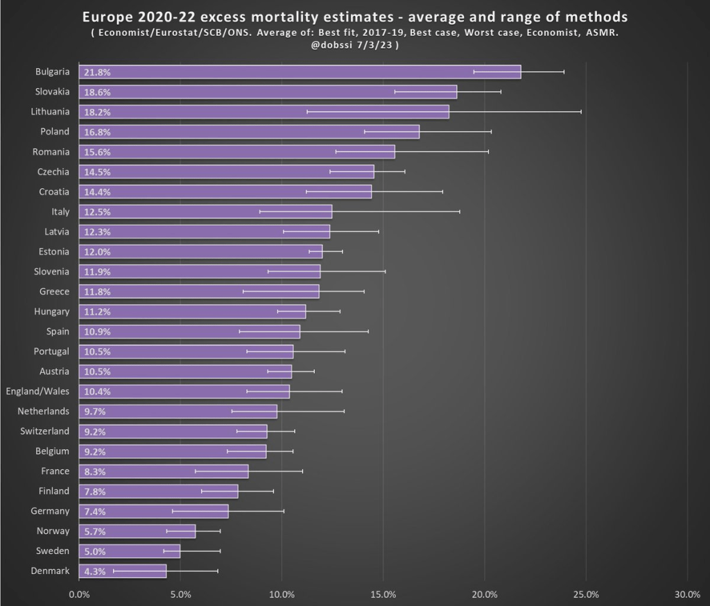 For many sharing this and similar chart (such as charts with just one of those methods), the surprising (or not surprising) result to them is that Sweden comes out with almost the lowest excess mortality rate. Some approaches even put Sweden as the very lowest. Sweden!
