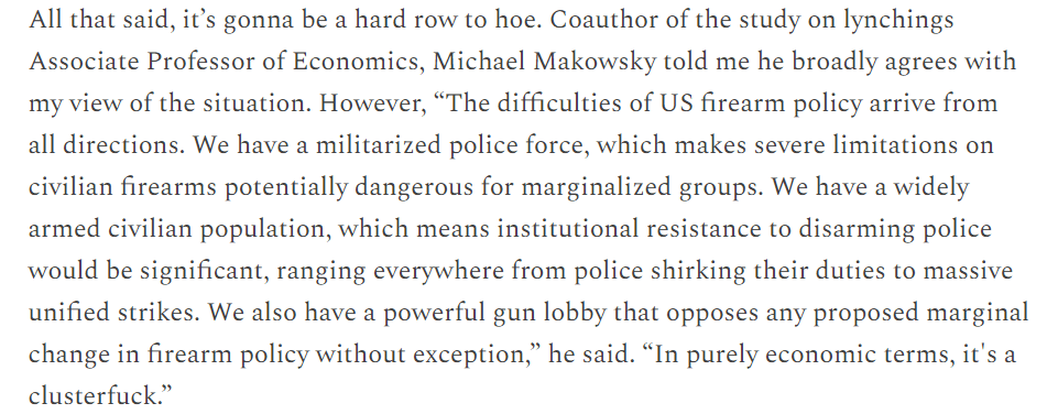 Let’s close with most discussed policy solution, an outright ban based centered around power and kill capacity. Banning a good with high demand is always difficult, just ask the war on drugs. If we’re going to try to ban assault rifles, we need to go in with our eyes open. Assault weapons are by and large consumption goods, if not outright toys, and in case you can’t hear the derision in my tone let me be clear I am absolutely judging you for owning one. They have zero value for hunting: a .556 round from an AR-15 will destroy your quarry. Better hunting option: anything firing .45-70 caliber ammunition. An assault rifle has negative value for defending your family at home. The through-wall collateral damage leaves you as likely to harm your family as any intruder. Better home defense option: any 12 gauge shotgun. An assault rifle is not a bulwark against tyranny any more than a samurai sword would have been living in a rural town in the Jim Crow South. We all need to accept that we are woefully outmatched in terms of physical and human capital in a confrontation on the local monopsolist on violence. Better option: join a peaceful political action organization. Join a major political party. Hell, join a local religious group. Resistance against tyranny is about numbers, not the stopping power of the weapon you or your drinking buddies are holding.