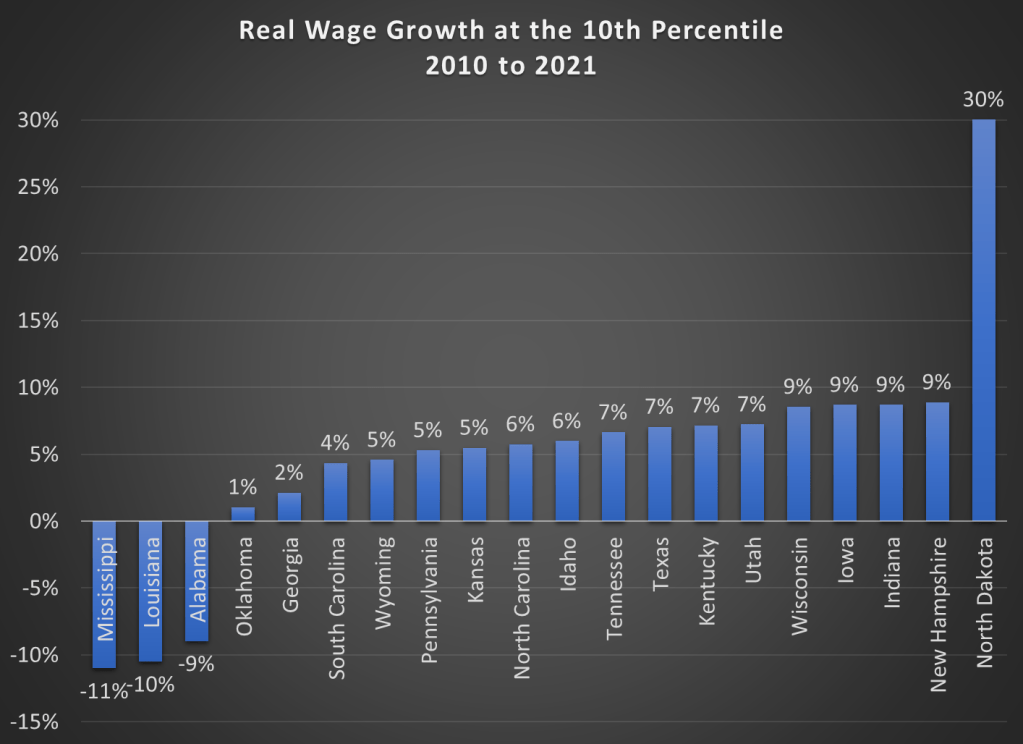 But maybe what’s going on is that employers are just providing wage increases that keep up with price inflation. So while fewer workers are earning the federal minimum wage, maybe they are no better off. We can address that possibility using BLS’s occupational wage data, which allows us to look at wages at the 10th percentile (these aren’t exactly minimum wage earners, but they are close). Real wage declines did happen in a few states (Alabama, Louisiana, and Mississippi), but most of these states experienced clear real wage growth from 2010 to 2021 at the 10th percentile of earners.