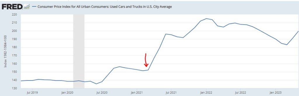 https://fred.stlouisfed.org/series/CUSR0000SETA02 – – Consumer Price Index for All Urban Consumers: Used Cars and Trucks in U.S. City Average