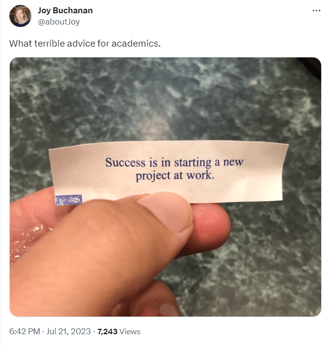 At a Chinese restaurant, I got a fortune that said, “Success is in starting a new project at work.” It struck me as very funny, and it resonates with other people on Twitter.