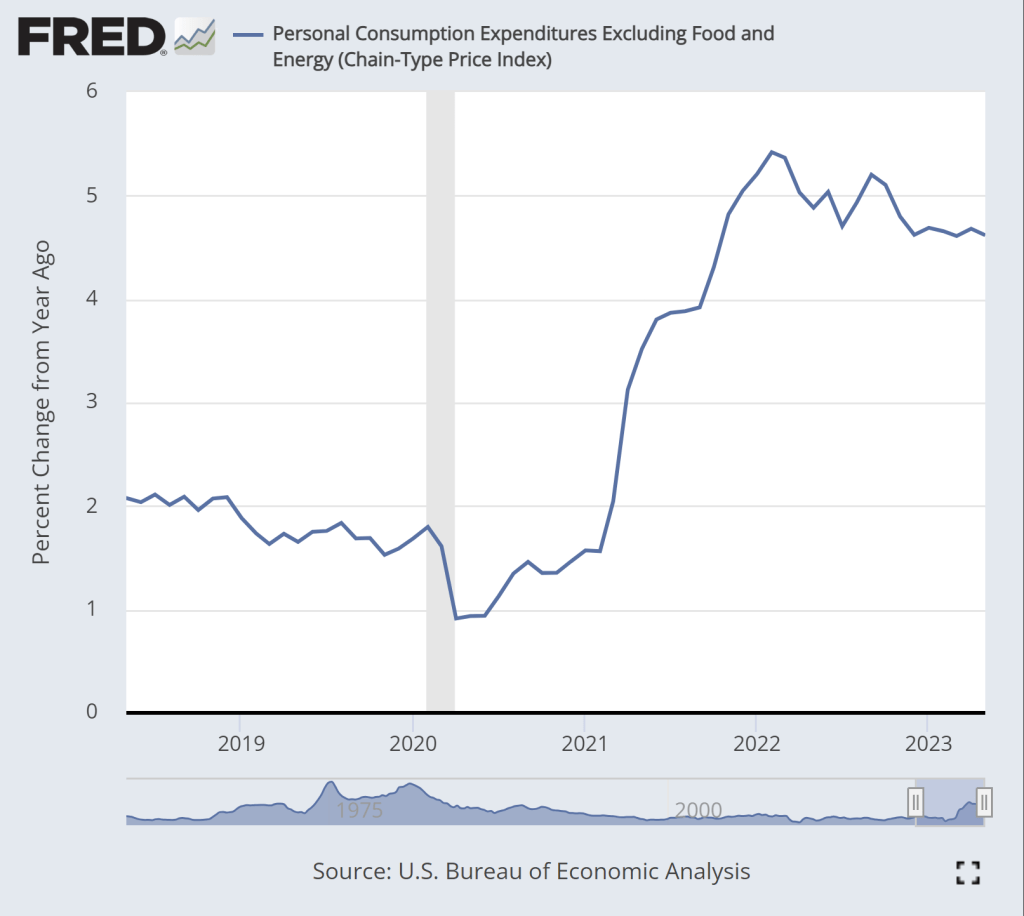 The pessimistic take can be summarized in two charts. First, this chart shows the year-over-year change in the core PCE inflation index. As most readers will know, core indexes take out food and energy prices. This is not a “cheat” to mask important goods, it’s done because these are particularly volatile categories of goods. If we want to see the true underlying trend in inflation, we should ignore price fluctuations that are driven largely by weather and geopolitics.