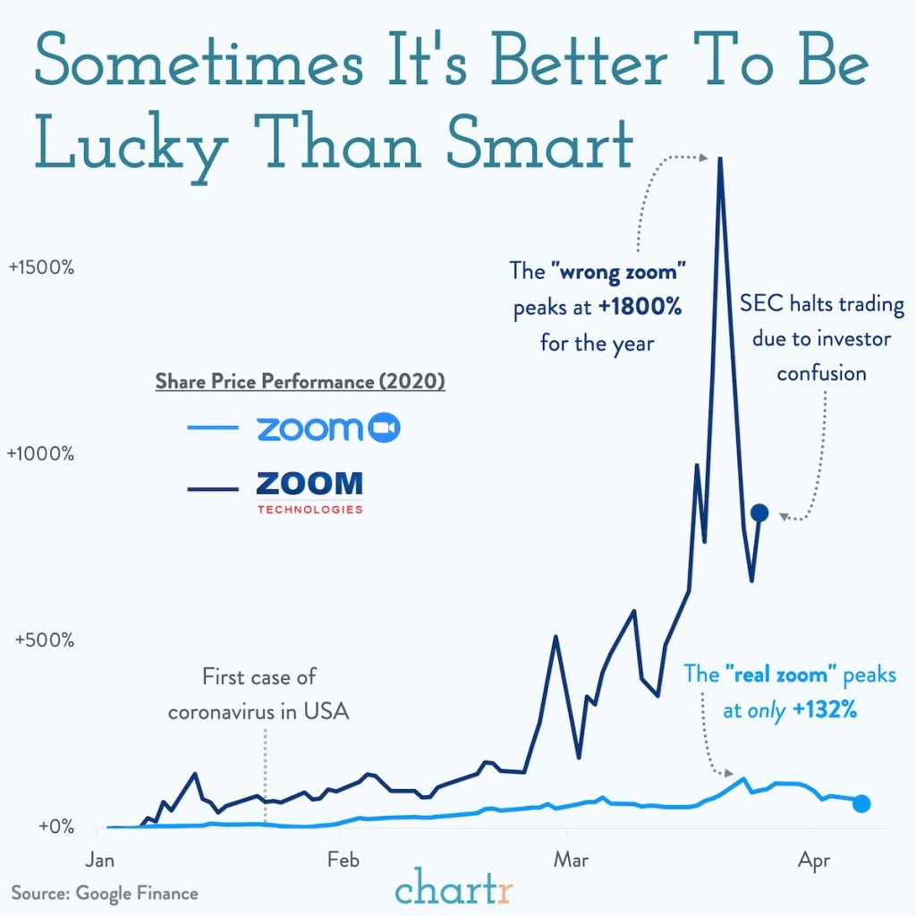 But with the Covid era the anomalies just kept piling up. All through February 2020, the smart people on Twitter were increasingly convincing me that this would be a huge pandemic; the main thing reassuring me was that stocks were up. But by late February they finally started crashing; instead of trusting the markets, I apparently should have trusted my own judgement and bought puts. Then investors starting buying the “wrong” Zoom instead of the one whose business benefitted from Covid: