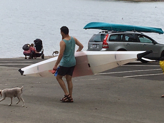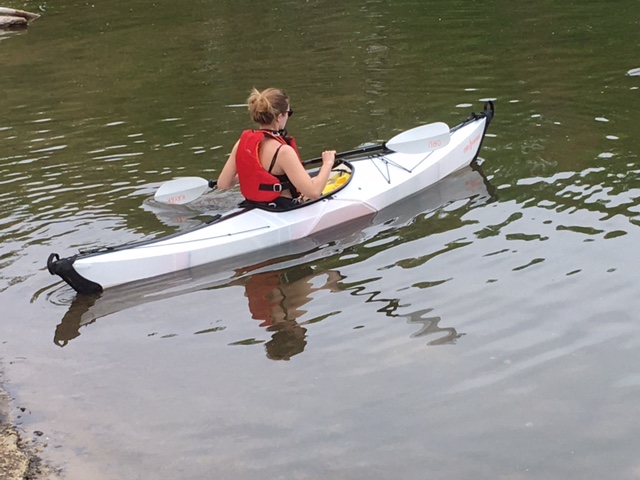 I also found through that experience that kayaking was very uncomfortable for me. But I do like canoeing. So, after seeing how great the folding kayak was, I looked online and found a similar collapsible canoe, made by MyCanoe.  The design is a little harder to execute, because with a canoe you have an open top, whereas with a kayak you can seal up the top and get the whole boat to be something of a nice structural tubular structure. But the MyCanoe seems to work OK, and has the same advantages of being lightweight (19 lb for one-person Solo, 43lb for two-person Duo) and of folding into a small package for transport and storage. There is an oar-lock accessory so you can row it with two oars, as an alternative to paddling. The Solo is pretty short and wide, so it is very maneuverable , but I would be surprised if it tracks well in a straight line when you just want to paddle from point A to point B using one paddle.