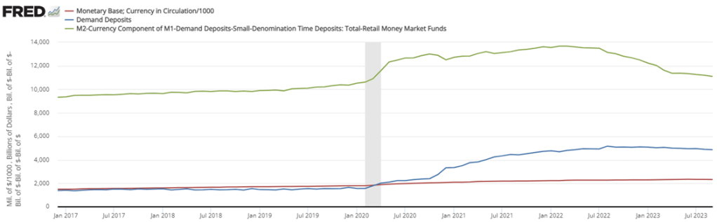 The monetary base includes both bank reserves and currency in circulation. We could break it down further, but I’ll save that for another time. What we see is that while currency in circulation did grow faster post-covid, it was nothing compared to the growing reserve balances. From January to May of 2020, currency grew by 7.5% while reserves almost doubled. That means a few things. 1) People weren’t running on banks. Covid was not a financial crises in the sense that people were withdrawing huge sums of cash. 2) Banks were well capitalized, safe, and stable. Further, uncertainty aside, banks were ready to lend. And they did. Not long after the recession, everyone and their brother was re-financing or taking on new debt. More recently, we can see that currency has stabilized and, again, most of the action has been in reserve balances. As of September 2023, reserve balances are down 23% from the high in September 2021.