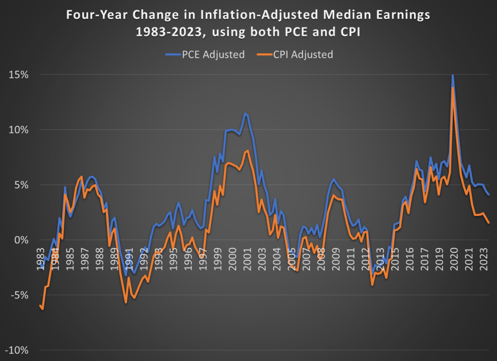 Unfortunately this data doesn’t go back far enough to do the October 1980 comparison, though other median wage data clearly shows that wages were lower in 1980 than in 1976. Interestingly, we see that once again by the time of the 1984 election, the median worker was still not better off than 4 years earlier (though getting close).