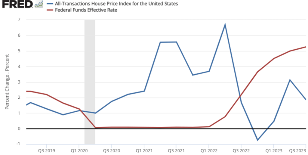 The third quarter ‘All Transaction’ housing price data was just released this week. These numbers are interesting for a few of reasons. One reason is that home prices are a big component of our cost of living. Higher home prices are relevant to housing affordability. This week’s release is especially interesting because it’s starting to look like the Fed might be pausing its year 18-month streak of interest rates hikes. In case you don’t know, higher interest rates increase the cost of borrowing and decrease the price that buyers are willing to pay for a home. Nationally, we only had one quarter of falling home prices in late 2022, but the recent national growth rate in home prices is much slower than it was in 2021 through mid-2022.
