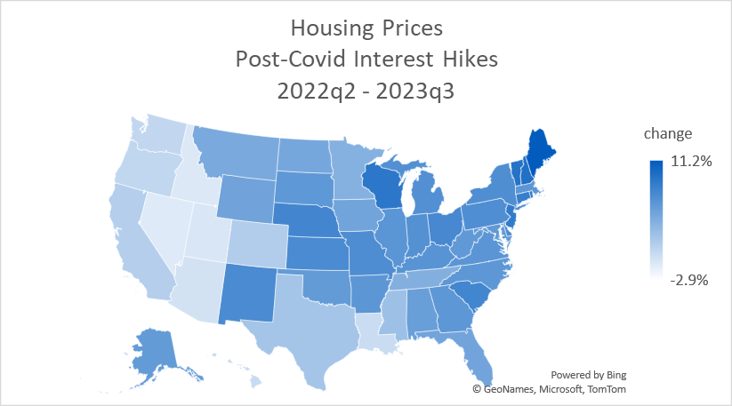 What do we see? Housing prices have risen in all but five states since 2022q2. Except for the District of Columbia, all of states with falling prices are western states. While prices have risen everywhere else, the gains are especially noticeable in the northeast, the east coast, the rust belt, and the parts of the Midwest. The most severe increases are in the northeastern corner states. People have plenty of opinions about real estate. But, if you’re thinking about purchasing a home or an investment property right now, then you might intuit that the best deals are in the south and out west (by historical standards anyway). On the other hand, if you are a property owner, then owning anywhere else has been good for your property value since interest rates started rising – but especially if you live in the Northeast (Maine, New Hampshire, & Vermont).