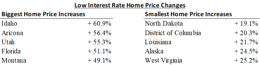 But before we get too excited about potential buying and selling opportunities, we should consider the context. How did prices change in the *low* interest rate period prior to 2022q2? Below is the same map from 2020q1 – 2022q2 and the top & bottom states.