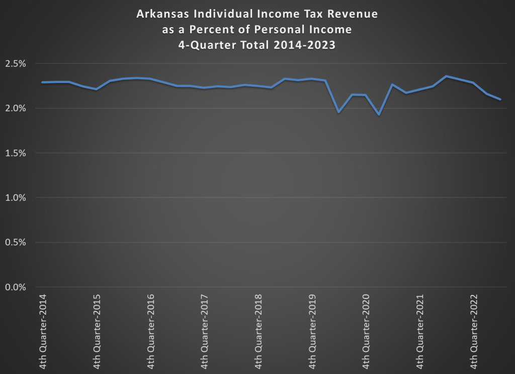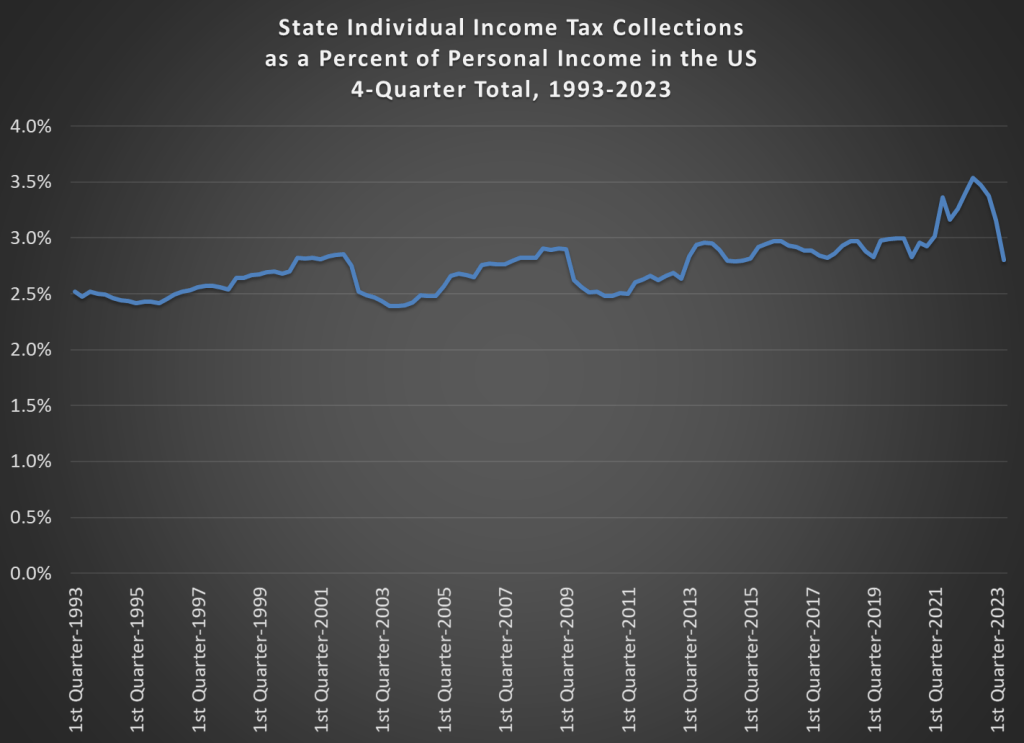 We will still see the drop in 2023, but notice now where it is dropping back to: about 2.8%. From 2013-2020, the range was about 2.8-3.0%. So we’re at the bottom of that range, but certainly well within what we would consider a normal range for individual income tax collections. And keep in mind that’s despite the fact that there has been some major income tax cuts across about half the states in the past 3 years!