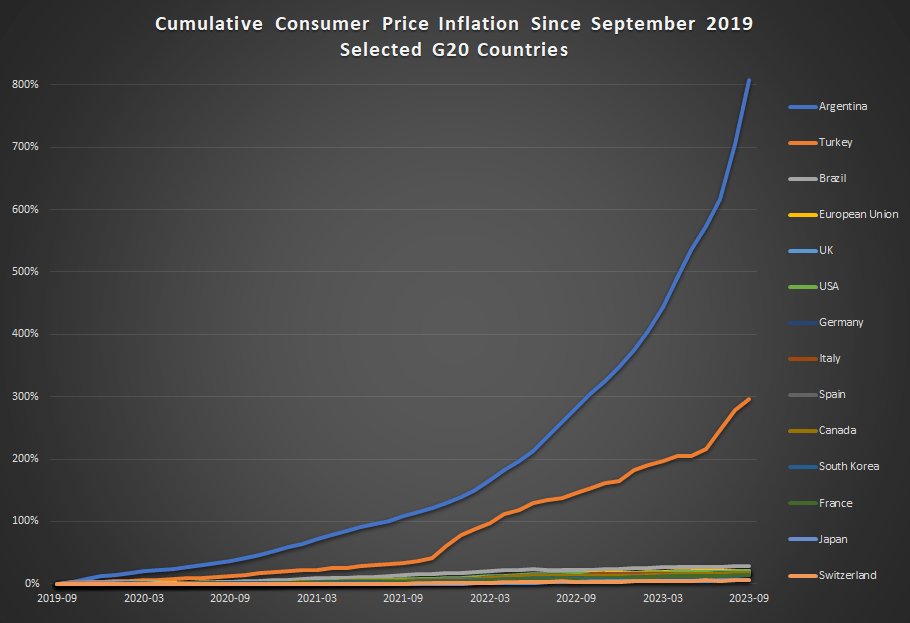 How bad is inflation in Argentina? Here’s a comparison to some other G20 countries from September 2019 through September 2023 (data from the OECD).