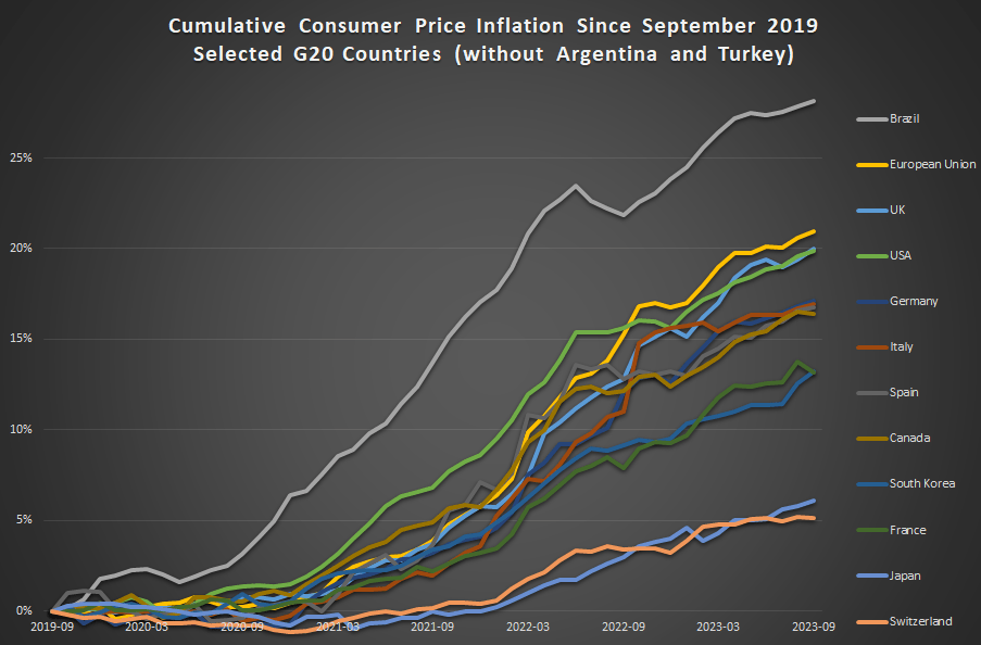 In this second chart we see two standouts on the opposite end of the spectrum: Japan and Switzerland have had extremely low inflation, just 6 and 5 percent cumulatively since late 2019 (and this is not unusual for these two countries in recent history).