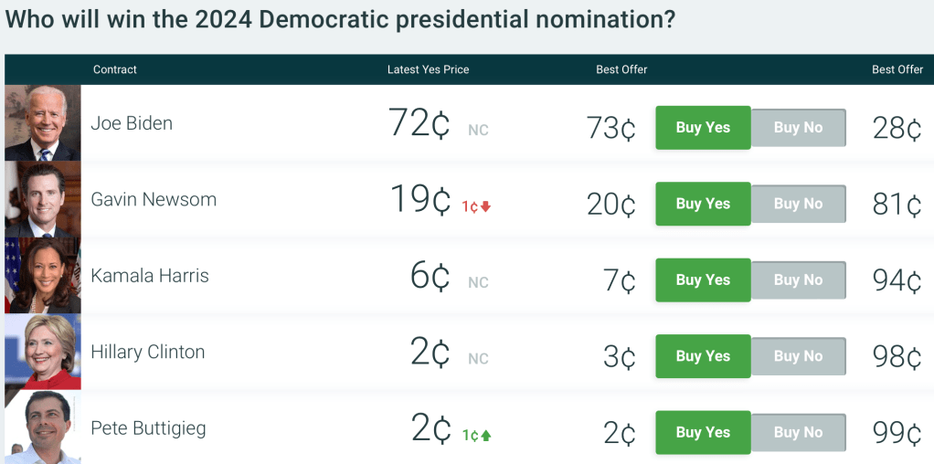 President Biden winning the Democratic nomination is currently priced at 72 cents on PredictIt, implying a roughly 72% chance of winning the nomination. Not the general 2024 election- where he is priced at a mere 43 cents- but the Democratic nomination.