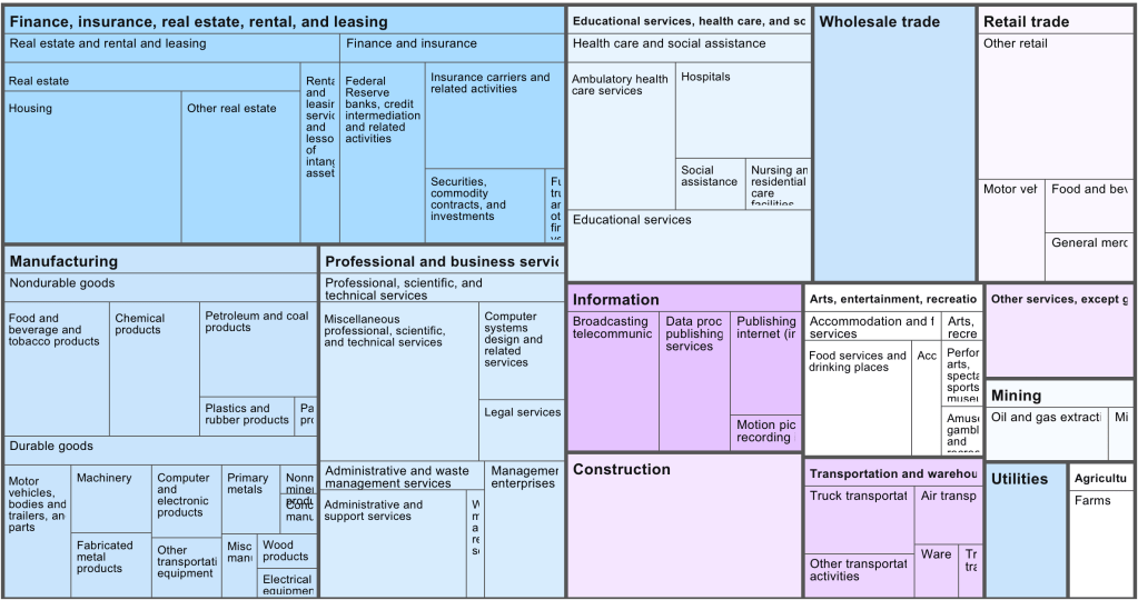 Venture capital firm Fifty Years has done a nice job cataloging exactly which industries see the most, and least, investment relative to their size. Here is their picture of the US economy by industry market size: