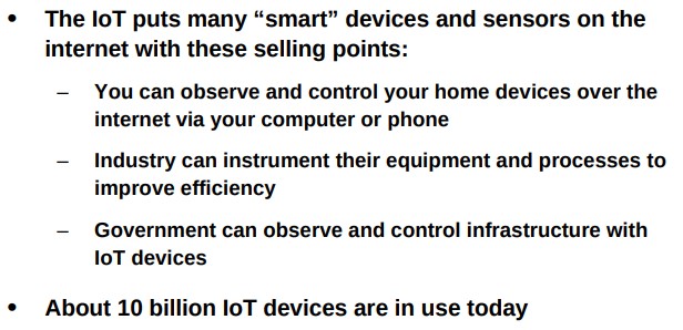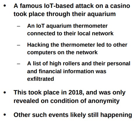 But it turns out the hazards with smart devices are widespread indeed. IoT devices are so useful for bad guys that that they are attacked more than either mobile devices or computers. One layer of hazard is the hacking of specific, poorly-secured devices in a home or institution, with subsequent control of devices and infiltration of broader computing systems. This will be the focus of today’s blog post. Another layer of hazard is the use to which masses of (sometimes private and personal) data snooped from “unhacked” smart devices are put by large corporations and state actors; that will be considered in a part 2 post.
