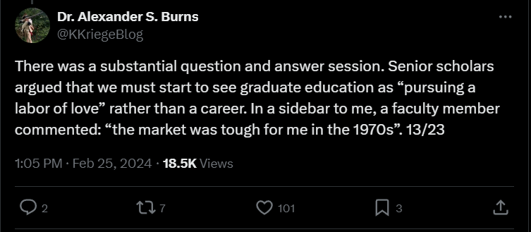 Alex Burns recapped a conference session about the market for PhD students in History. It was, predictably, rather despondent as is the nature of the job market for all graduate students in history, but doubly so for those outside the absolutely most elite 3 to 5 schools. The whole thread tells the story of graduate education in history, and the broader humanities, with sincerity and empathy.