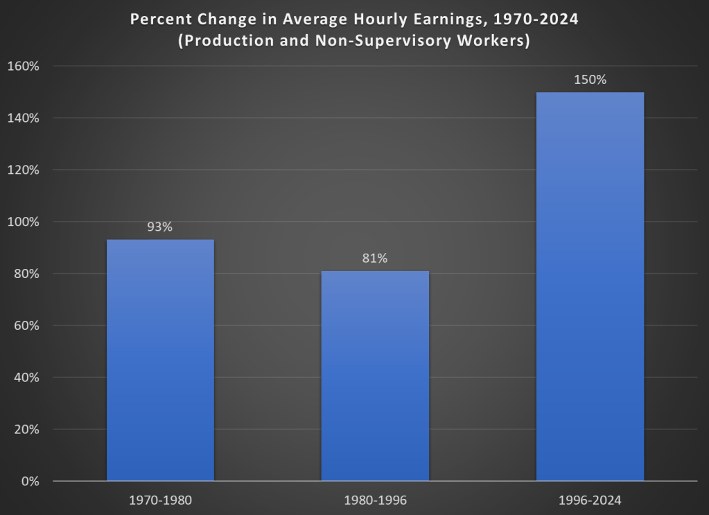 Keep in mind with the chart above that prices (as measured by the CPI-U) increased by 100% for each of these time periods. So, for the 1970s and 1980-1996 periods, wages actually rose by less than rate of inflation — wage stagnation! If we used the PCE price index instead, those time periods still don’t look good: PCE prices increased by 88% for 1970-1980, 85% from 1980-1996, and 78% since 1996. With either price index, the 1996-2024 period is clearly the best of these three, and it’s not even really close.