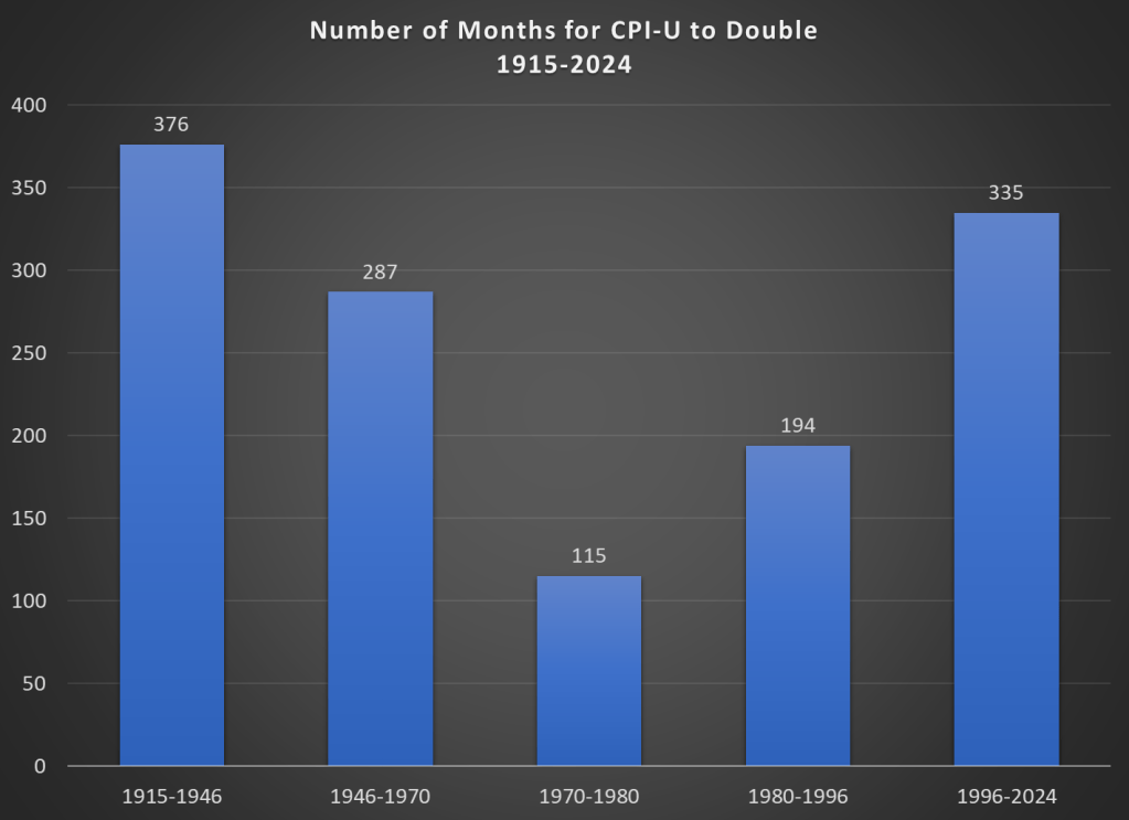 Here’s one approach. Using the latest CPI-U data, we can see that prices on average approximately doubled between March 1996 and February 2024. That’s 335 months to double, or just shy of 28 years. How long did it take prices to double if we keep moving backward in time from March 1996?