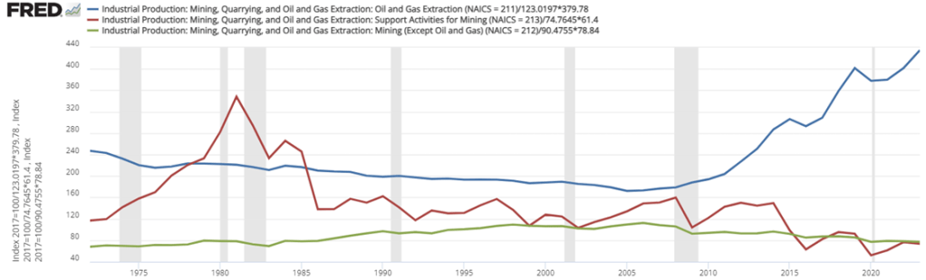 For people concerned about resource security, the recent boom is good news. For people who associate digging with environmental degradation, greater extraction is viewed with less enthusiasm. Those emotions are especially high when it comes to fossil fuel production. Below is a graph that identifies the three major components of extraction indexed to the 2021 constant prices. By indexing to the relative outputs of a particular year, the below graph is a close-ish proxy to real output that is comparable in levels.