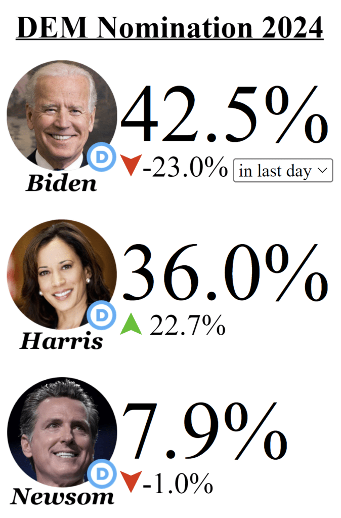 The answer again I will suggest is: watch the betting markets. And if you check the betting markets today (aggregated across multiple markets by EletionBettingOdds.com), you will see that Biden and Kamala Harris have roughly equal chances of becoming the next President (and Trump is about a 60% favorite):