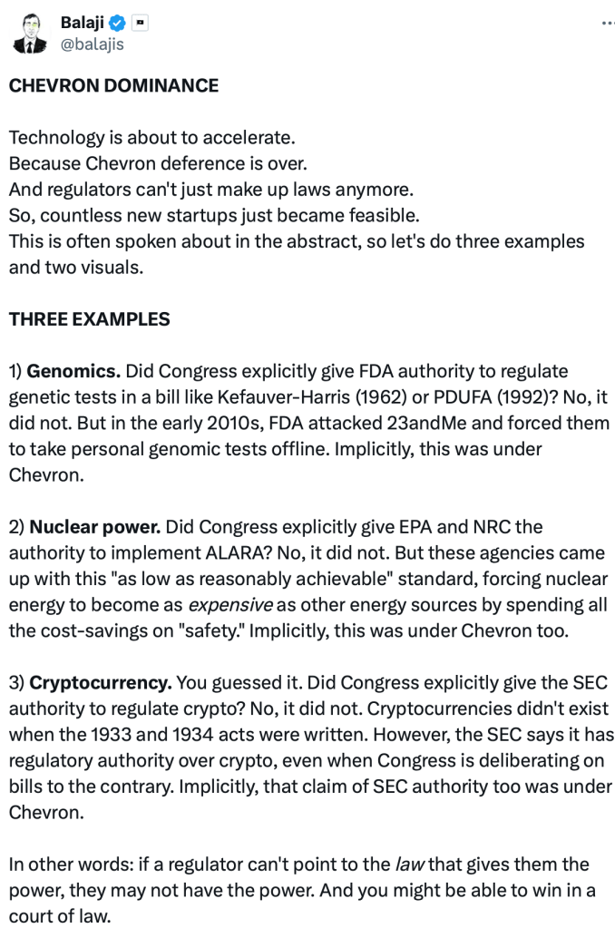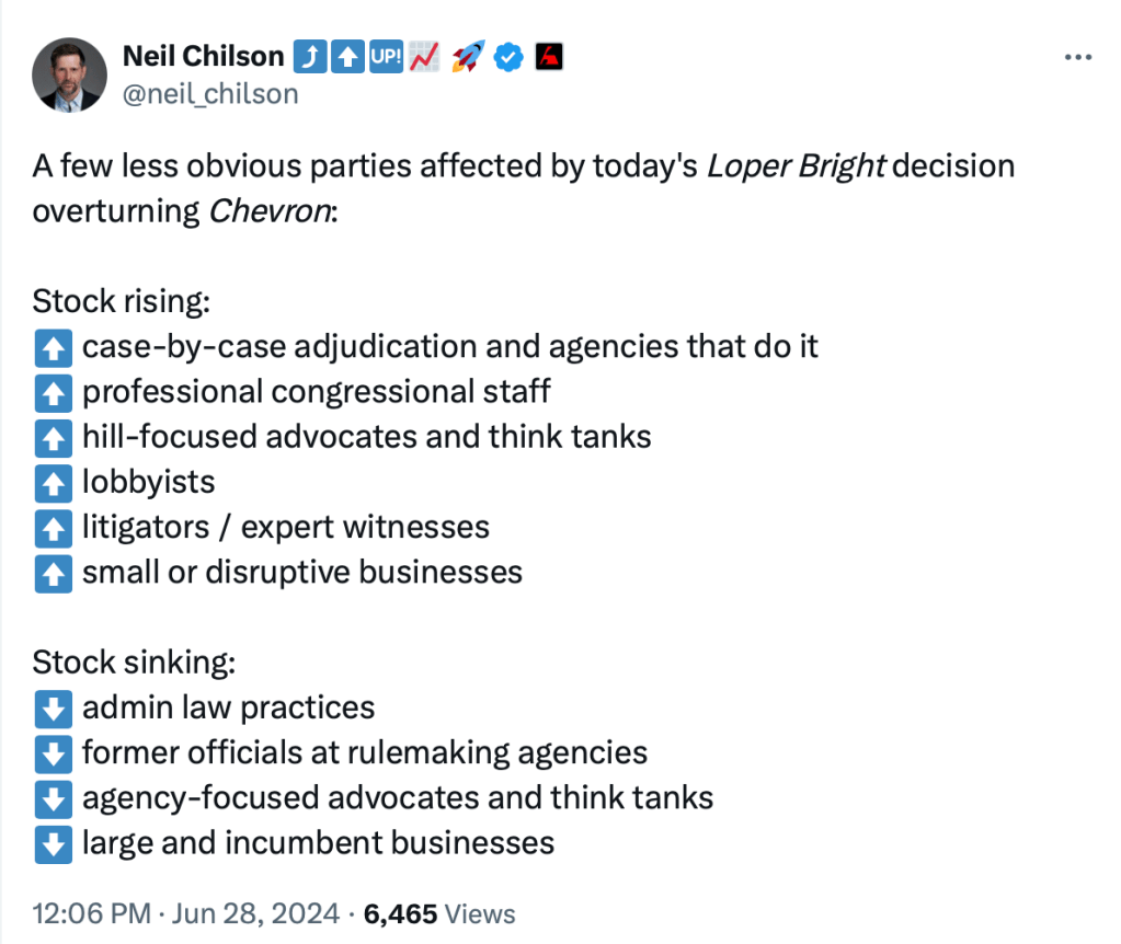 Last Friday the Supreme Court overturned the doctrine of Chevron deference as part of its ruling in Loper Bright Enterprises v Raimondo. This might not have even been their most discussed ruling of the past week, but in my (non-lawyerly) opinion, there is a good chance it will be their most economically impactful ruling of the past decade. SCOTUSblog explains the basics: