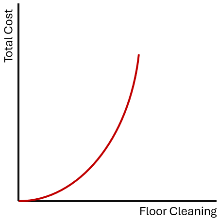 What does that mean? That means that each minute spent performing some activity is more costly that the last. Sometimes, contrarian students or redditors will incredulously and confidently proclaim that increasing marginal cost is just an assumption and an unrealistic folly of the field of economics. To which I say: Poppy cock. Economic costs are opportunity costs. That is, the dollar costs of an activity may not rise (though they probably do), but the *value* of the foregone activity increases relative to the value of the current activity. For example, I can clean the floors and still get 7-8 hours of sleep. But I can’t do both and also repair things around the house, fold laundry, and do dishes. And you can forget about sitting and resting. The more time one spends cleaning floors, the more valuable are the things that one forgoes.