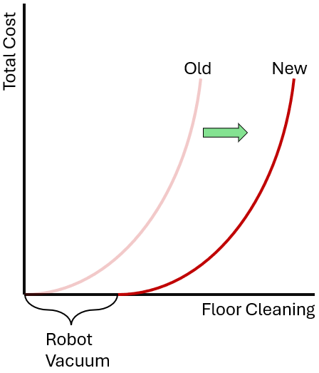 The problem is that costs are convex. As our youngest reached the age of two, the crumbs began to spread more as her independence and sense of entitlement developed. The floors were getting crummier at an increasing rate (compounded by other kids). I would sweep and vacuum when I arrived home earlier than my wife so that she was happier when she arrived, violating my ‘make hay when the sun shines’ maxim. Often, she’d vacuum or sweep again after the kids went to bed. We each spent tens of minutes cleaning floors daily. That may not sound like a lot, but again, costs are convex.
