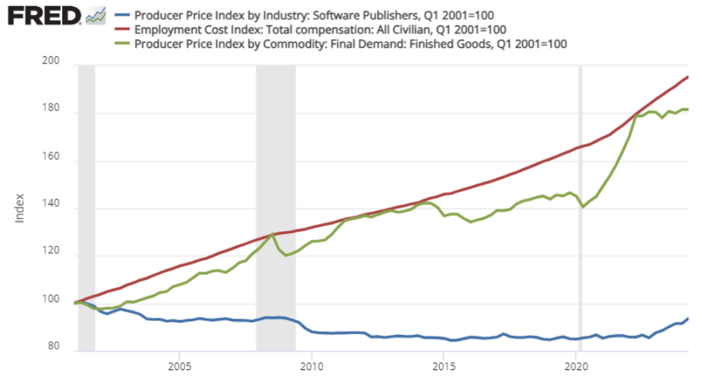 What should we see in the ‘real world’ if the above story is right. Services provided by labor would be expensive, physical goods would be less expensive than labor, and software would be the least expensive (I’m thinking about marginal costs). Below is the producer price index (PPI) for software, the PPI for finished goods, and the employee total compensation index. It reflects the story above.