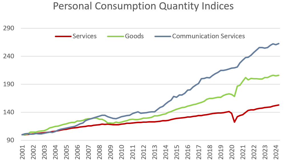 We can look at the national accounts and see a similar story. Software is a little tricky just because it’s included in the production process of plenty of other services and goods. Below is personal consumption price index for goods, services, and communication services in particular (which is only sort of a proxy for software). It tells the same story.