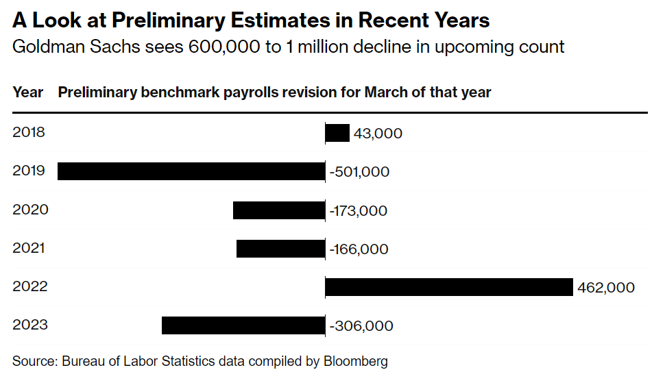 That brings us to the release today, which is the preliminary estimate of the benchmark adjustment for March 2024 (it will be finalized early in 2025). And that preliminary estimate was a big number, with a downward revision projected of 818,000 jobs. To put this in perspective, the current CES data shows 2.9 million jobs were added between March 2023 and March 2024, so this estimate suggest that the job growth was overstated by perhaps 40 percent. That’s a big revision, though large revisions are not unheard of: the same figure for March 2022 was an estimated 468,000 jobs higher, while March 2019 was 501,000 jobs lower. But this year is a big one (largest absolute number since 2009). Here’s a chart summarizing recent years revisions from Bloomberg: