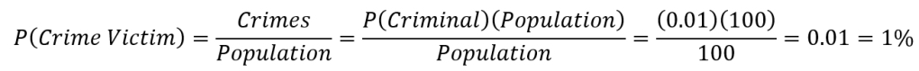 Let’s start with some basics. Say that a criminal commits 1 crime against 1 victim per time period. Also say that everyone in the population has an equal probability of being a victim. Therefore, if there is a population of 100 and 1% of them are criminals, then there will be 1 crime committed and each person has a 1% chance of being a crime victim.* The specific numbers here don’t matter, but they let us use a concrete example.