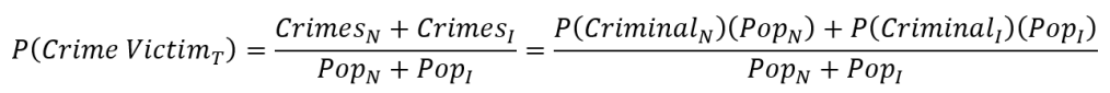 In reality however, the two populations are not segregated. If one of those immigrants comes to the US, then it impacts (1) the probability that anyone becomes a victim, and (2) the probability that a native person becomes a victim. Below is the math for the probability that anyone becomes a victim, now that we have that we’ve added one immigrant to the overall population. Again, I assume that everyone has an equal probability of being a victim. Since migrants and non-migrants tend to commit crimes against those in their in-group, that changes the degree and not the nature of my results. The subscripts of N, I, and T denote native, immigrant, and aggregate values.