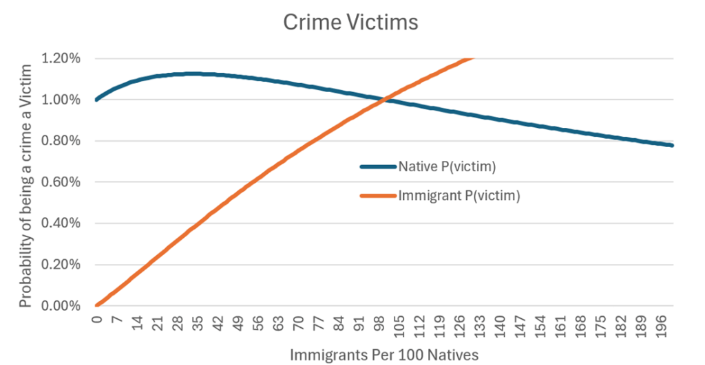 Given a native population of 100, the graph below illustrates that adding an additional immigrant monotonically lowers the probability of victimizing natives. That’s a fancy word that means that there is no number of immigrants at which more harm is done to the native population. The probability of an immigrant being a victim is not the same as the probability of a foreigner of being a victim. It’s conditional on their immigration. So, there are zero immigrant victims when there are zero immigrants.