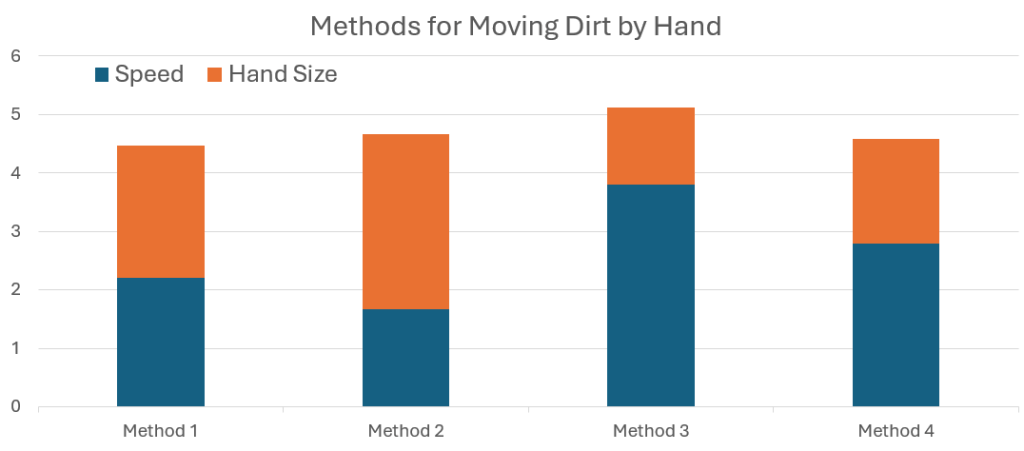 Humans have been moving piles of dirt around for as long as humans have existed. Imagine the most primitive case in which it’s just you and a pile of dirt. There are no tools or machinery and your job is to move the pile from one place to another. Let’s say that two things can matter: 1) how fast you can walk and 2) the size of your hands. Holding constant the mass of dirt and the time in which it is moved, there are a lot of ways one could succeed. You could leverage speed and move the handfuls quickly. Or, you could leverage the size of your hands and attempt to take bigger handfuls with each trip.