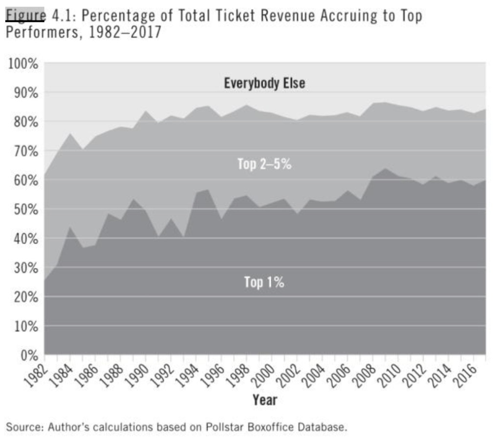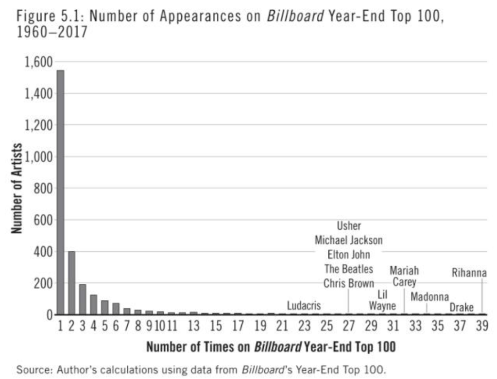 I missed Alan Kreuger’s 2019 book on the economics of popular music when it first came out, but picked it up recently when preparing for a talk on Taylor Swift. It turns out to be a well-written mix of economic theory, data, and interviews with well-known musicians, by an author who clearly loves music. Some highlights: