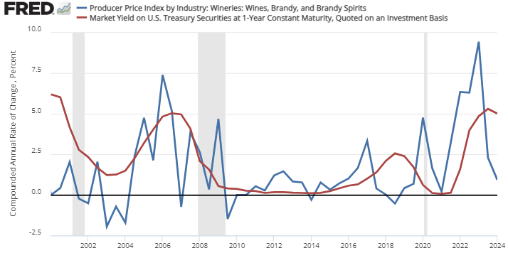 Everyone faces an opportunity cost. Vintners can choose to tie-up their resources in grapes and vines, or they can sell it all and invest in the US treasuries. Of course, the former has some non-pecuniary benefits. I’m not ignoring those. But if the prices of grape-related products fall adequately or if treasury yields are high enough, then the vintner may cease to hold his title and instead become a run of the mill investor.