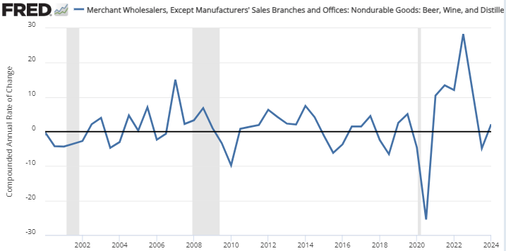 When interest rates rise, vintners sell off their older stock whose value is growing too slowly. Below is the growth rate of the producer price index for wines, brandy, & spirits and the yield on the 1-year US treasury. They tend to rise and fall with a lag. Of course, US treasury yields and the wine PPI both correspond to demand for goods and services. When the Federal Reserve raises rates, it puts downward pressure on the price of consumer goods – including wine. But they also correspond to supply. The second graph below is the inventory-to-sales ratio for beer, wine & spirits. When the price of alcohol goes up, so does the inventory. This tells us that it’s not just demand that’s driving the prices. When the price rises, implying a higher rate of return, suppliers hold more stock so that it too can grow in value. Holding stock implies that the wine is getting older. Once the interest rises however, inventories start to decline as the older wine is pushed out the door.