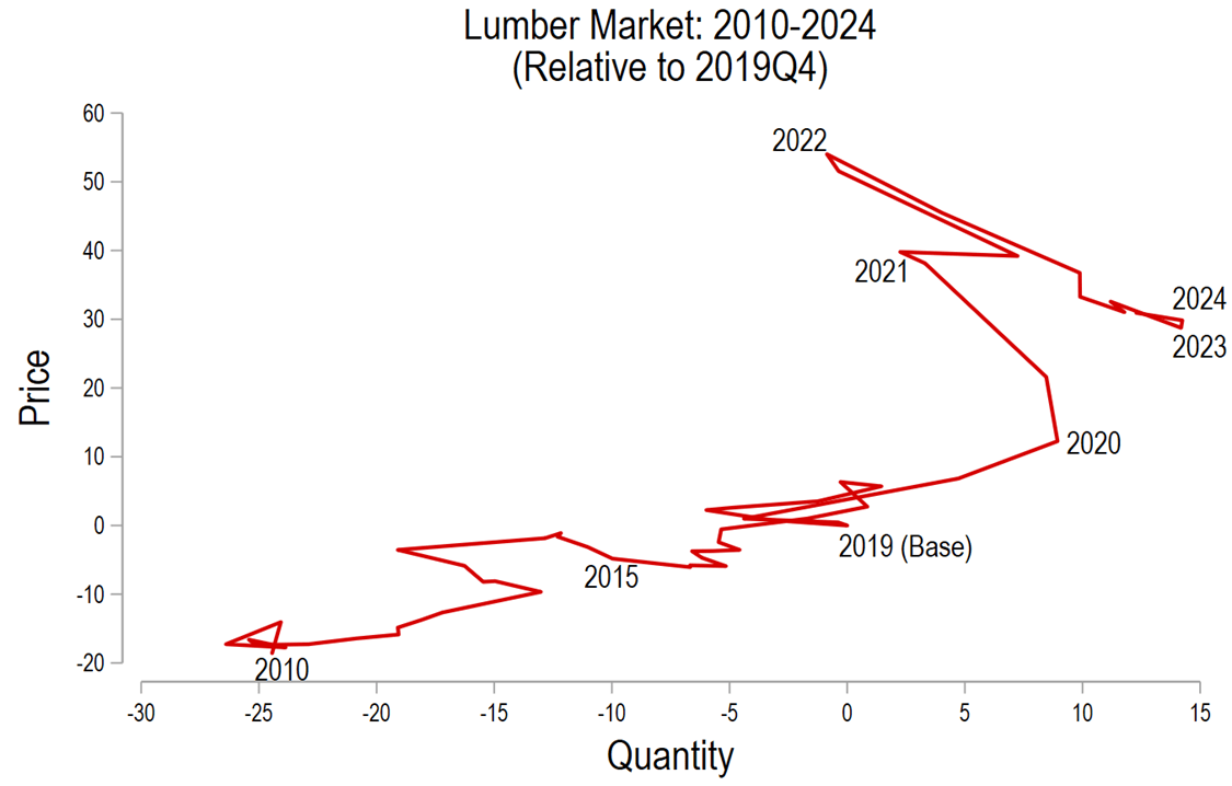 Here I’ll lean on the price and quantity series from the national accounts by industry for “Wood Products”. This includes lumber, wood flooring, plywood, etc. Below is a graph that charts out the supply-and-demand journey from 2010 through the second quarter of 2024. What do we see? Demand for lumber steadily increased from 2010 through 2019. Then, after a brief decline, there was a sudden boom in demand, soliciting 9% more output in a single year. Prices rose similarly by 12%. But in 2021 and 2022, the other shoe dropped. Higher labor and input prices, thanks to general economy-wide inflation, increased the costs of production. Less lumber was produced in early 2022 than pre-pandemic. The pattern was similar in the overall economy.