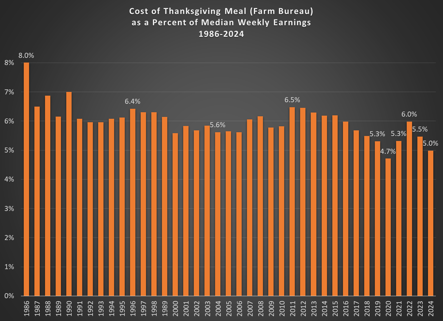 As a percent of median weekly earnings for full-time workers, the Farm Bureau Thanksgiving meal will cost just 5 percent of weekly earnings (note: I use 3rd quarter earnings for each year, since it is the latest available for 2024). In 2020 it was only 4.7 percent, but other than that 2024 is lower than all other years for which we have data, which goes back to the mid-1980s, when it took 6-8 percent of earnings to buy this meal.