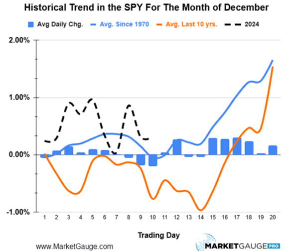 Here is a chart showing average changes in S&P 500 prices for the month of December for 1970-2023 (blue line), and more recent data (last ten years, orange line).