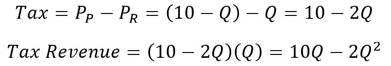 Conveniently, the tax revenue can be described by the quantity transacted, or the tax rate, or the price paid, or the price received. There are a variety of ways to tackle the problem. Regardless, the tax revenue-maximizing values are all consistent with one another. If we substitute the demand and supply equations into the tax equation, then we can express the tax rate in terms of the quantity transacted. Then, we can substitute that expression into the tax revenue function, making it a function of the quantity transacted.
