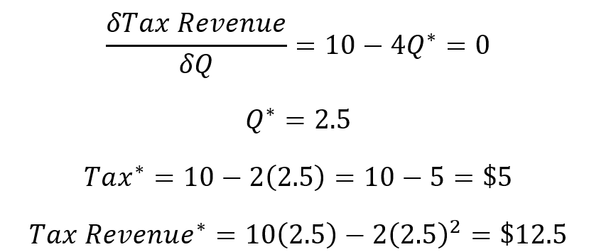 Finally, a little bit of calculus lets us find the Q at which tax revenue is maximized. We can substitute that into the tax function and the tax revenue functions to find the tax revenue maximizing values.
