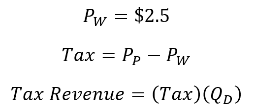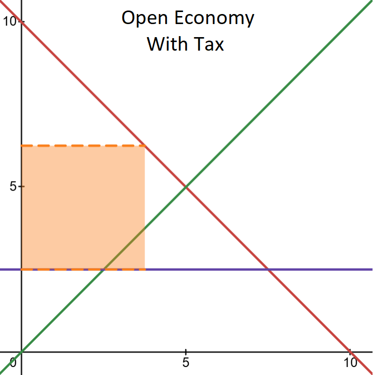 Let’s now open this economy up to international trade. We usually assume a constant world price for some good or basket of goods as a simplifying assumption. This assumption is perfectly fine for a small open economy. It may differ for economies that compose substantial portions of the world demand, but let’s stick with the simple case for now. I assume a world price of $2.5, this particular value doesn’t matter much. I chose it because it’s half of the domestic free market price. Obviously, changing the world price will change the maximum tax revenue. But it doesn’t change in a way that affects the quality of the logic.