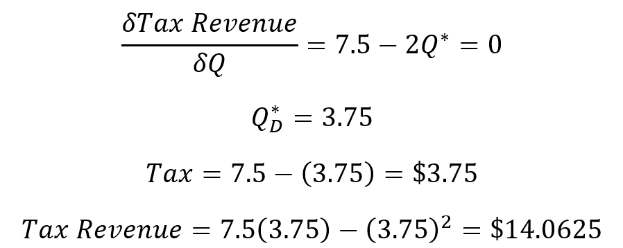 Calculus again can get us the tax revenue maximizing quantity demanded and the tax rate.