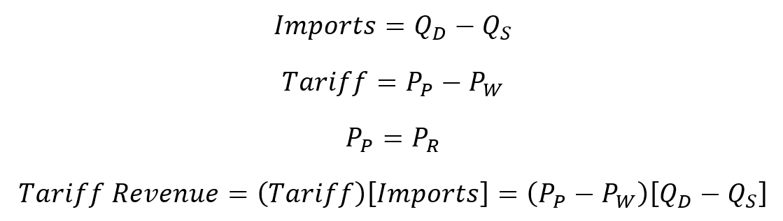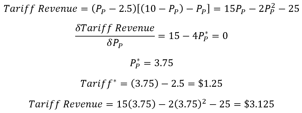 Unlike the previous cases, I think that it’s easier to express tariff revenue as a function of the domestic price. I substitute the supply and demand functions into the tariff revenue function. Calculus gets us the tariff revenue-maximizing price paid.