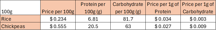 Here’s a very simplified example. Say that you have only two food characteristics that you value: Protein content and Carbohydrate content. Also say that you can spend your money on rice and chickpeas. While life would be simple, you can choose how much of either to eat. Below is a table of price, protein, and carbohydrate content per 100g of food and the price per gram of nutrient (See also the mythology the of rice & beans).