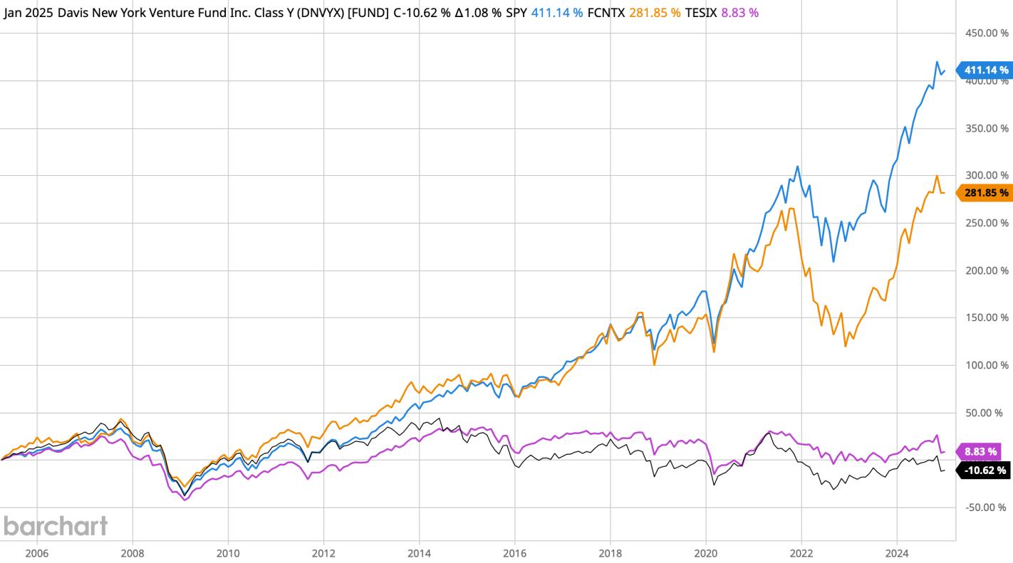 It is a huge victory for the S&P (in blue). Franklin Mutual Shares is basically flat over the past 20 years, while Davis New York Fund actually lost money. Fidelity Contrafund returned a respectable 281% (about 7% per year), and matched the S&P as recently as 2020. But as of 2025 the S&P is the clear winner, up 411% in 20 years (over 8% per year). Score one for Bogle.